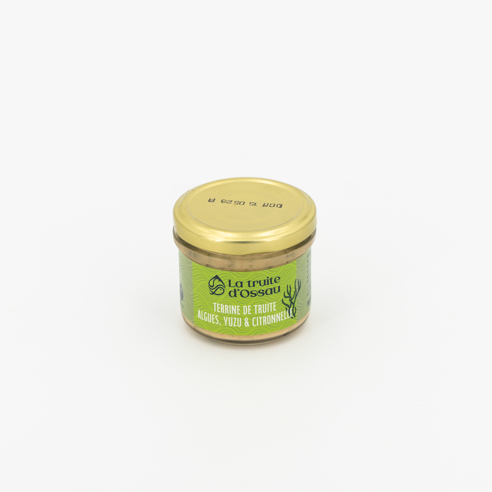 Goûtez notre terrine de truite aux Algues , Yuzu et Citronnelle, à tartiner pour l’apéritif ! Cette terrine a été élaboré dans notre atelier pour valoriser notre truite dans une démarche anti-gaspi, sans conservateurs, sans gluten ni additifs. Ingrédients : Truite 60% (Laitue de Mer, Dulse, Nori – origine Bretagne), crème fraîche allégée, Œufs, Yuzu, citronnelle, sel et poivre. Conserve appertisée de 90grs, à consommer de préférence avant la date indiquée sur le couvercle. A conserver 48h au frais après ouverture .